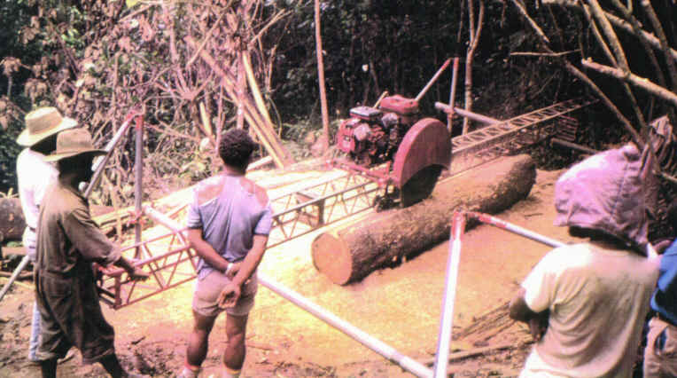 4. Wokabout Somill operating near Lae, Morobe Province, 1989. Two circular blades rotating at right angles on a hand-drawn rig cut out dimensioned timber. Click here to see paper on this.