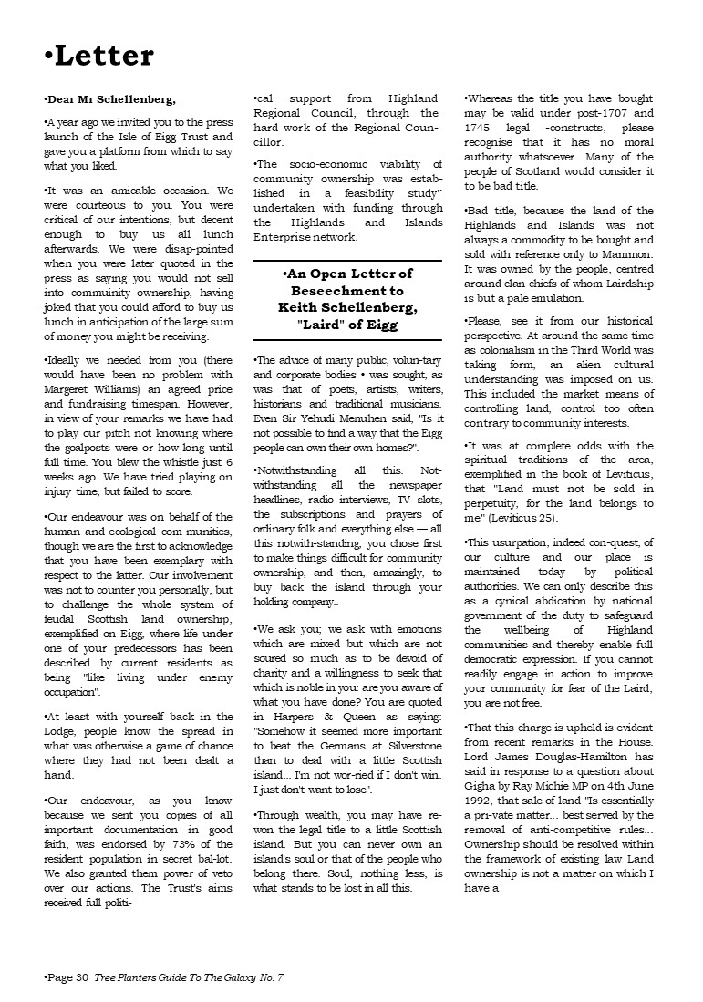 This slightly shortened version of the letter is as it was published in Reforesting Scotland, No. 7, Autumn 1992, pp. 30-31. (Please note that the original Isle of Eigg Trust has now been subsumed by the Isle of Eigg Heritage Trust with a different body of trustees - click here for further details on this and the success of the Eigg campaign.)