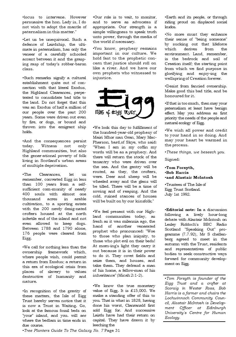keep dogs. Between 1788 and 1790 alone, 176 people were cleared from Eigg. We call for nothing less than the ownership framework which, where people wish, could permit a return from Exodus; a return in this era of ecological crisis from places of slavery to values destructive of humanity and nature. In