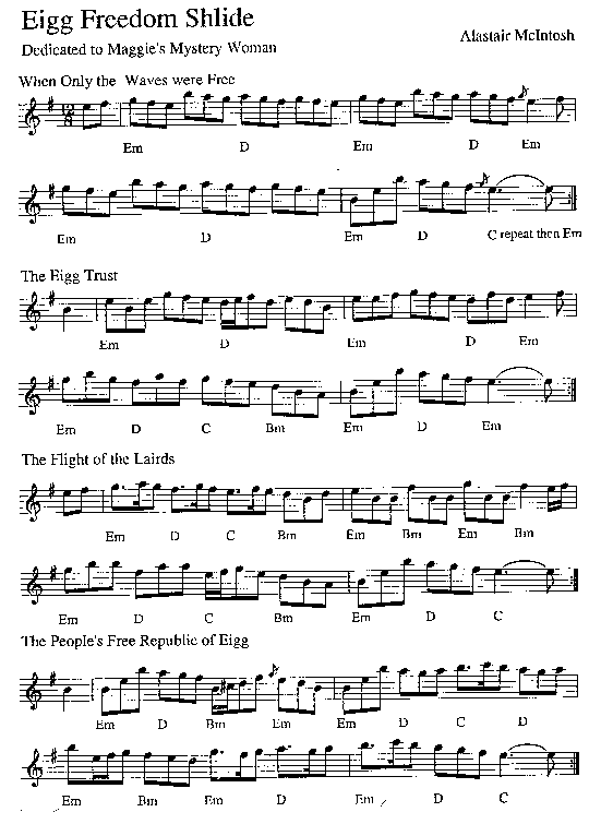 The Eigg Freedom Shlide I was asked by the Eigg Residents' Association to write this piece of music in 1997 to celebrate the island gaining its independence from landlordism. An account of the piece, as well as alternative chords, is given at the foot of this page. For more on music, ecology and social change see Music Teacher article, A Sound Ecology. (Postscript 2024: for the past 15 years I've been too deaf to hear music properly, and so, to the great relief of a great many, have had to give away my fine collection of Overton penny whistles and no longer play except in the mind).