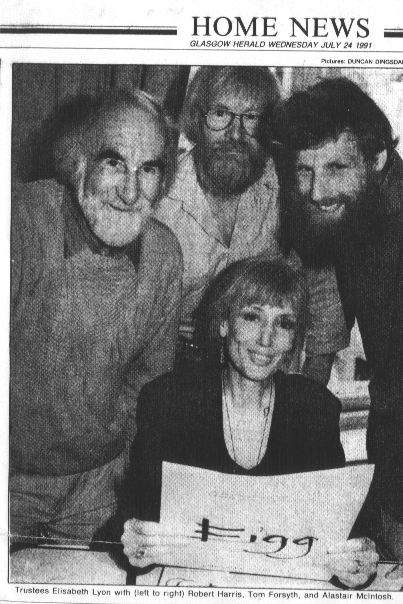The Original Isle of Eigg Trust - Pictures Click here for original Eigg Trust manifesto Click here for Eigg Trust campaign story Click here for official Isle of Eigg Heritage Trust website 1. The original Isle of Eigg Trust was launched in Edinburgh on July 23 1991, having been registered as a charitable trust by founding trustees, as shown in the launch photo below from the Glasgow Herald, 24-7-91, p. 9: Robert Harris, Tom Forsyth, Alastair McIntosh and Elisabeth Lyon.
