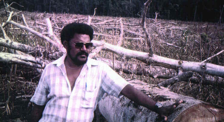 2. Badi, a Village Industries Research & Training Unit staff member in Bougainville, North Solomons Province, 1998, at a site clearfelled to make way for cocoa plantation. Click here for paper on the Bougainville Crisis.
