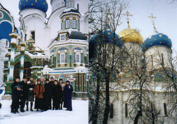 1. Academy of Sciences (Economics Dept) team at the Holy Trinity Sergyev Monastery at Sergyev Posad near Moscow. To my left is Mikhail Gelvanovsky, Director of the National Institute for Development at the Academy of Sciences, who stood in for our host, Dr Dmitry Lvov, who was ill. To my right is Verene Nicolas (Centre for Human Ecology), Fred Harrison (Centre for Land Policy Studies), Dr Tatiana Roskoshnaya (Land & Public Welfare Foundation, St Petersburg) and Dr Galina Titova (Centre for Ecological Security, St Petersburg). The others are economists from the Academy of Sciences in Moscow.