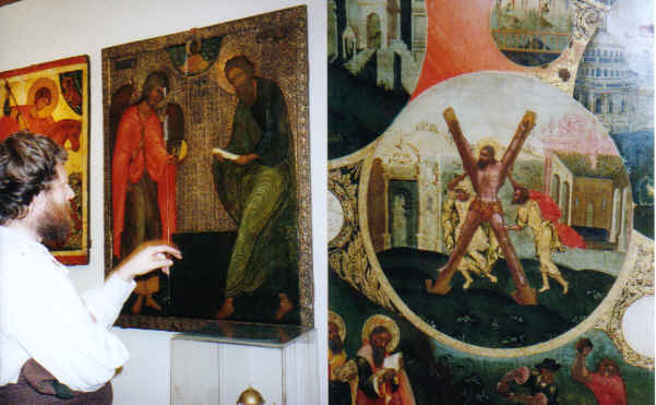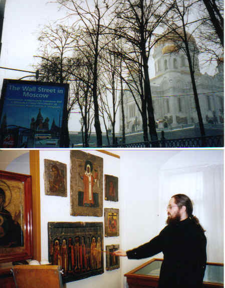 1. Contrasting iconography outside Moscow's new cathedral. 2. Museum of icons at the Holy Trinity Sergyev Monastery (February 2000). I said to the young priest pictured who had fluent English, "Where I come from many people would consider kissing an icon to be idolatrous. What do you say to that?" He replied, "It's the same as kissing a picture of your wife. It's not the paper you're kissing, but what lies beyond it."